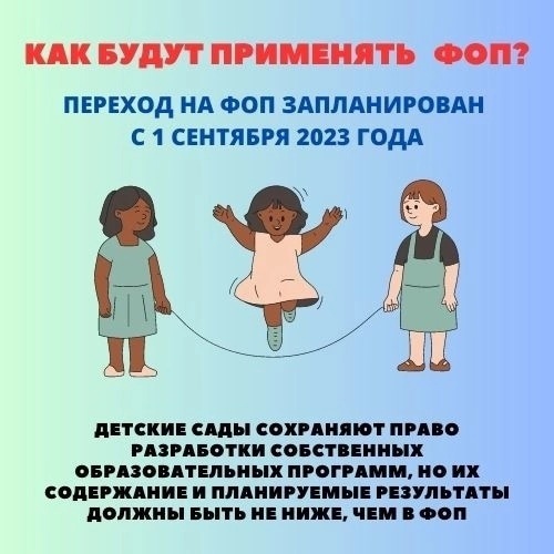 С 01 сентября 2023 года все детские сады переходят на работу по новой Федеральной образовательной программе дошкольного образования (ФОП ДО). Федеральная программа позволит объединить обучение и воспитание в единый процесс на основе традиций и современных практик дошкольного образования, подкрепленных внушительным объемом культурных ценностей. ФОП ДО заменит примерную основную образовательную программу дошкольного образования с 1 сентября 2023 года.